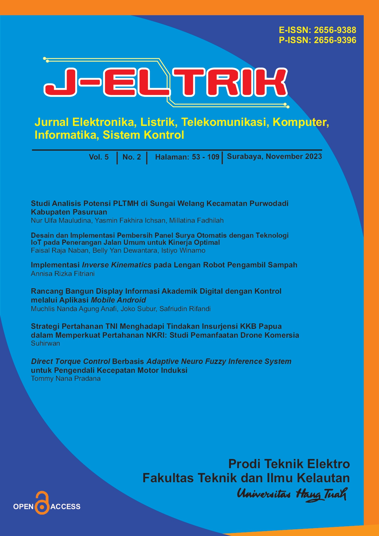 J-Eltrik: Jurnal Elektronika, Listrik, Telekomunikasi, Komputer, Informatika, Sistem Kontrol is published by Faculty of Engineering and Marine Science, Universitas Hang Tuah with E-ISSN: 2656-9396, P-ISSN: 2526-9388 . Its disciplinary focus is science and speciality in bio marine science. J-Eltrik is published in English for July and November. Each 50-60 page edition contains between six and seven scientific articles on research, case reports and study literature. Contributors of J-Eltrik included: dental researchers, lecturers, and students drawn from Indonesia and a wide range of other countries.